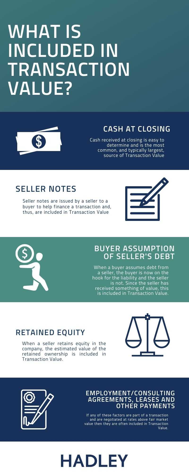 Most of the acquisitions completed by Hadley include substantial cash at closing, which makes calculation of the transaction value and finder’s fee relatively straightforward. However, other sources of consideration often come into play in small company acquisitions and can, collectively, be meaningful sources of Transaction Value (for the seller and, by extension, the finder).